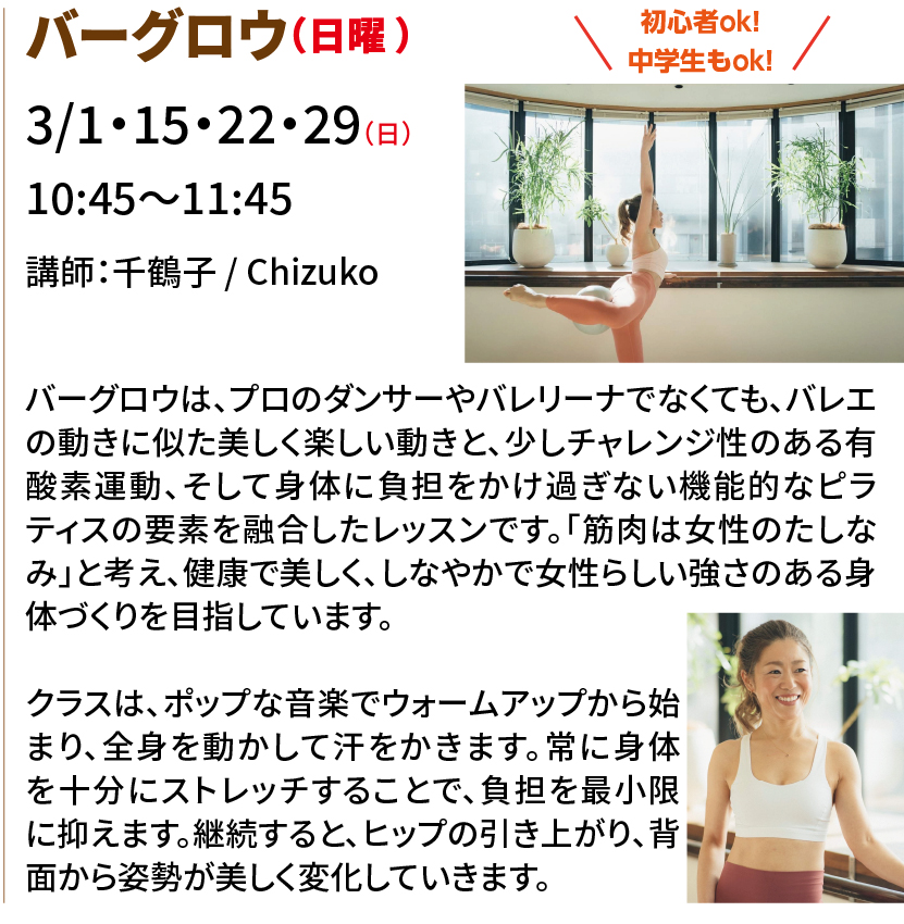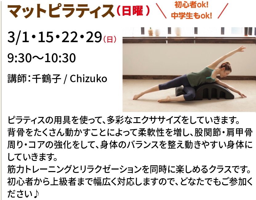 2026.02.26 ニュース マット ピラティス&バーグロウ 入会金半額キャンペーン! 大人の方を対象としたマットピラティス、バーグロウを開講。 レッスン動画はこちら レッスン動画はこちら ピラティス&バーグロウの申込み 一覧に戻る