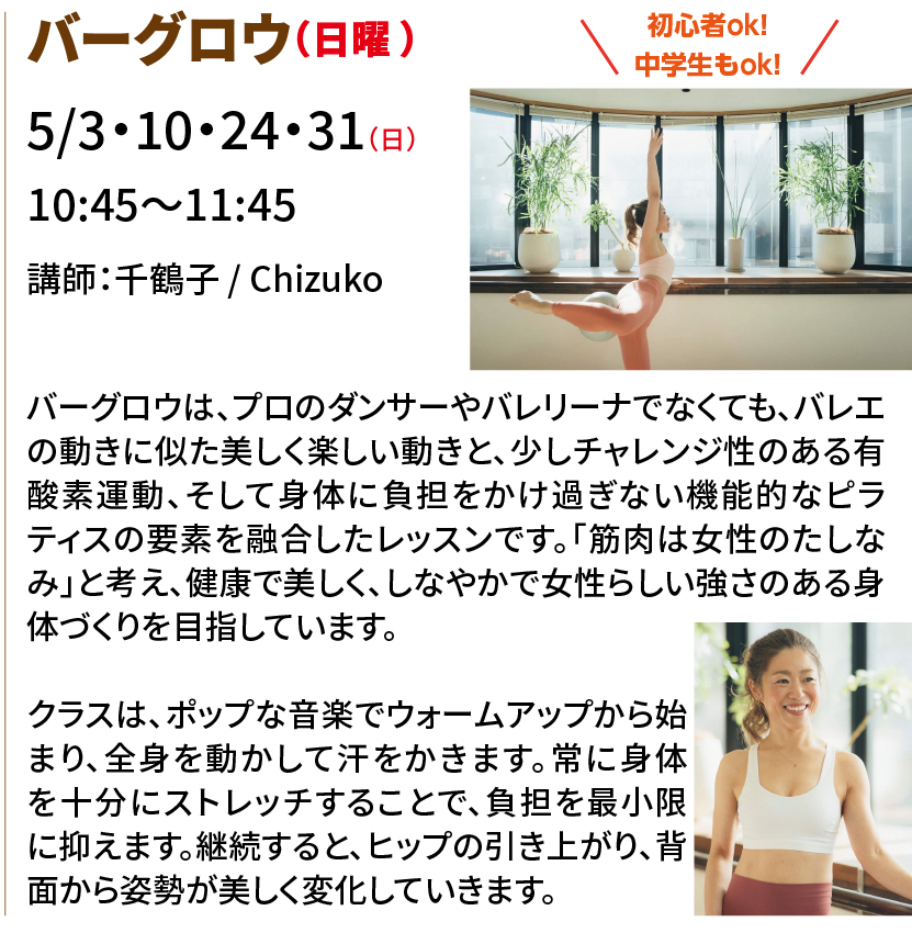 2026.04.29 ニュース マット ピラティス&バーグロウ 入会金半額キャンペーン! 大人の方を対象としたマットピラティス、バーグロウを開講。 レッスン動画はこちら レッスン動画はこちら ピラティス&バーグロウの申込み 一覧に戻る